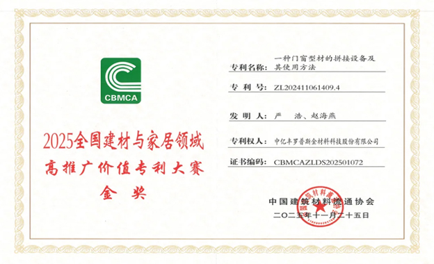 近日,,,“2025 全国建材与家居领域高推广价值专利大赛” 在佛山圆满落幕。。。。空羽数位凭借 “一种门窗型材的拼接设备及其使用方法” 专利技术,,,,成功斩获金奖,,彰显了公司在建材科技领域的创新硬实力!!!!