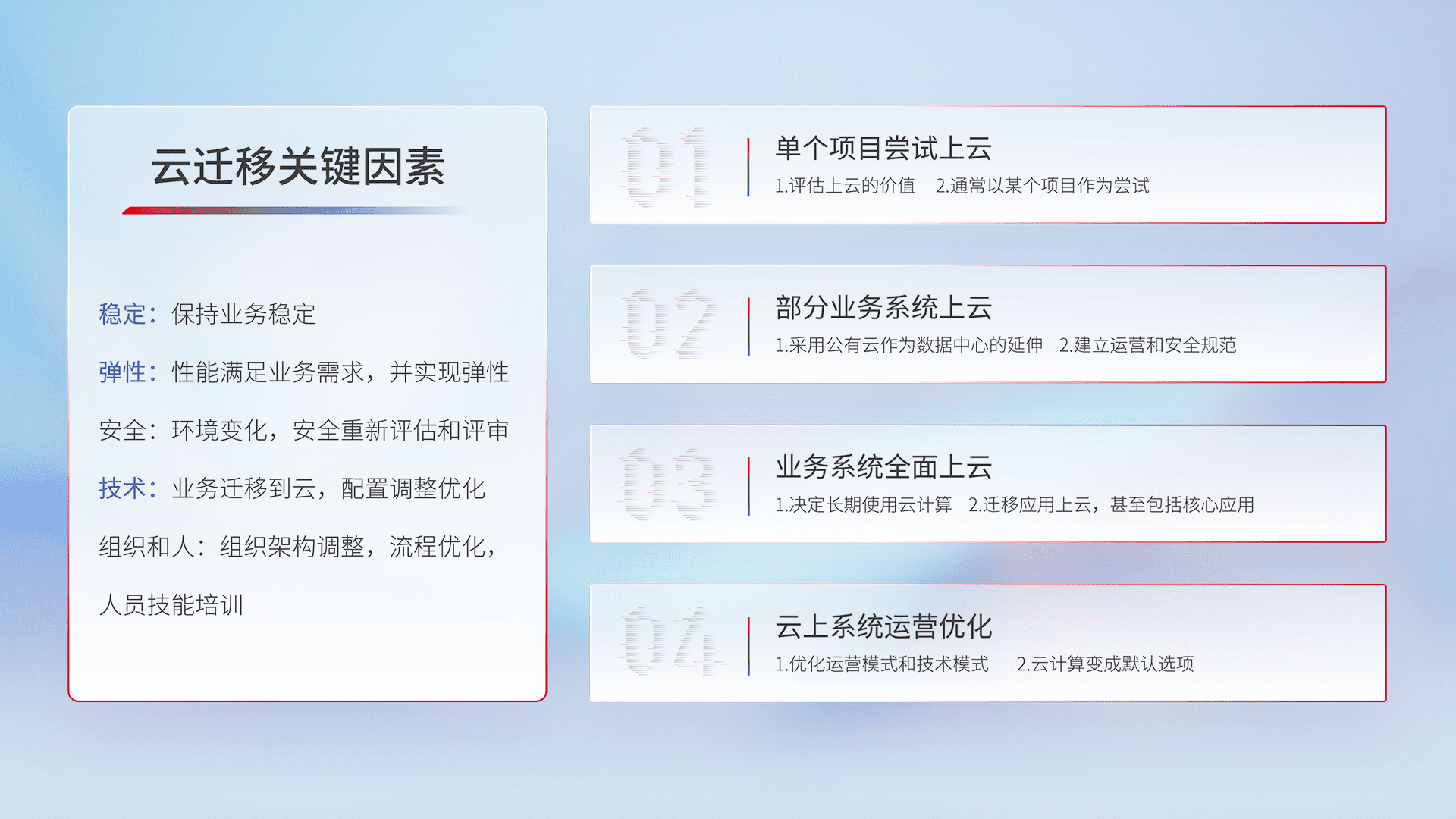 结合实际业务,,,从规划设计、、、、云平台选型、、、、云原生改造、、数据迁移、、、集成交付,,迁移全过程为客户识别最佳上云路径,,,,做好风险识别管理,,,设计网络架构、、、身份权限、、、、安全审计合规、、、、操作审计、、日志审计、、、、监控告警策略、、、、多站点容灾设计等,,对云上基础设施进行整体规划,,,,提升IT治理水平,,,,以满足弹性、、、、高可用、、高性能的需求。。